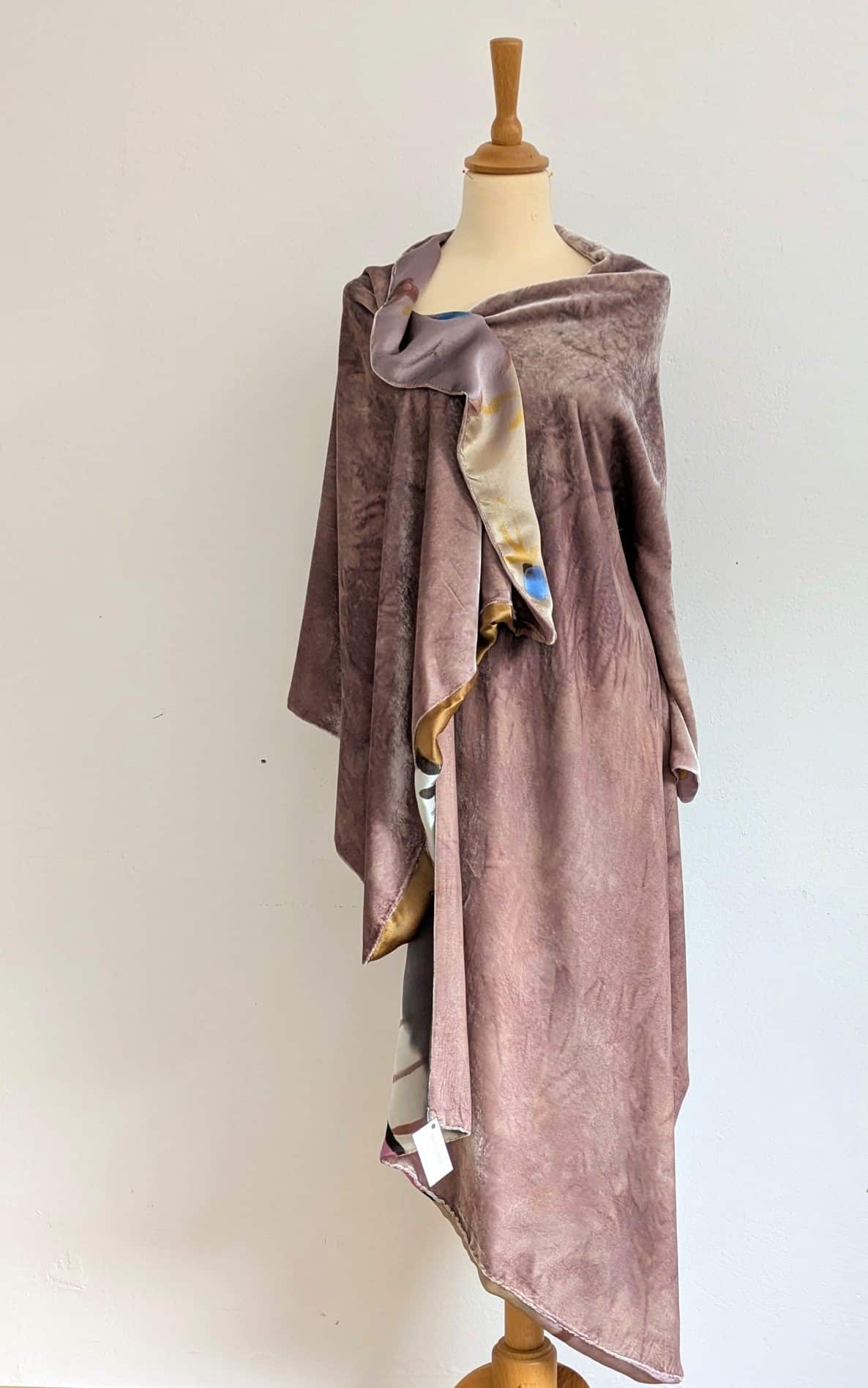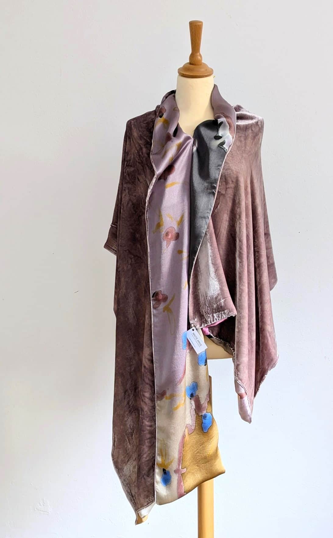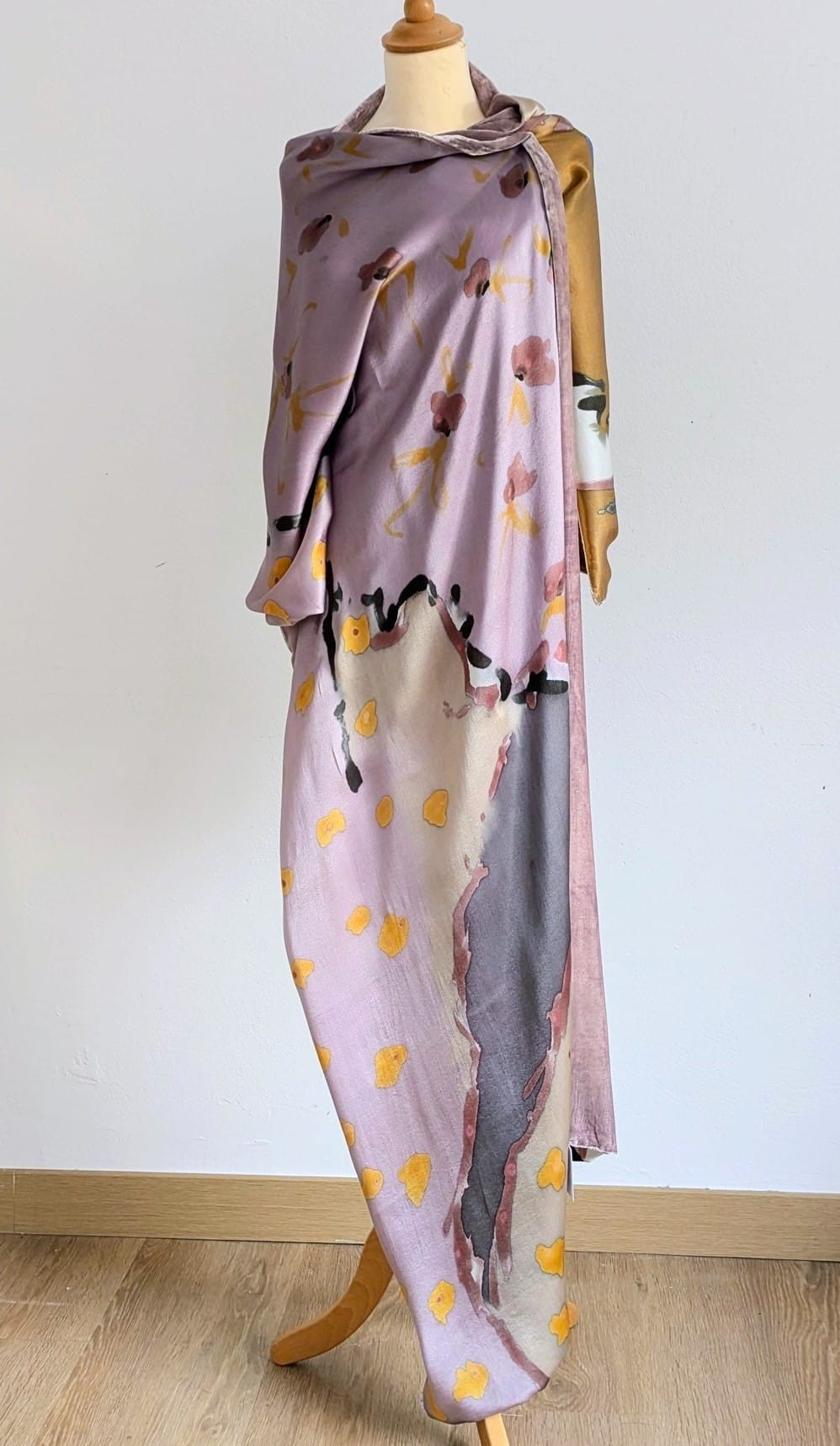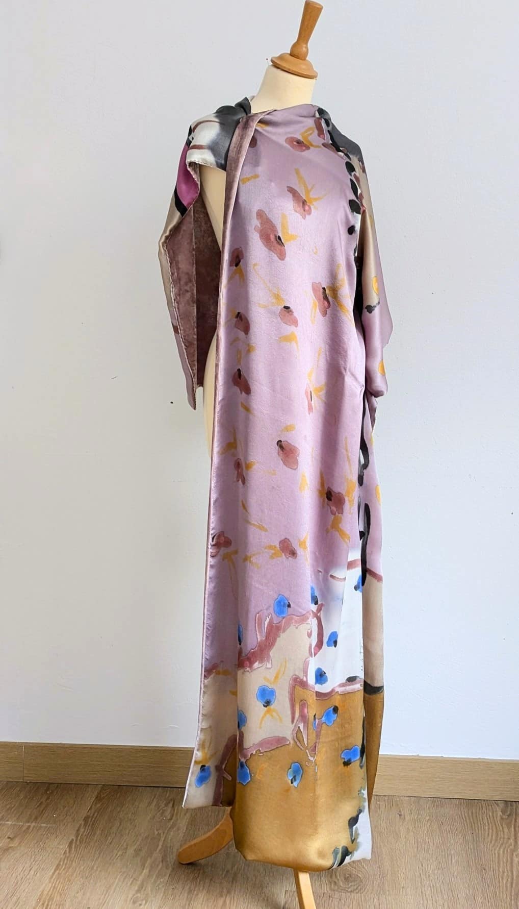 Terciopelo de seda teñido a mano y Seda natural (Satin 9) pintada a mano, exclusivamente, con pincel.